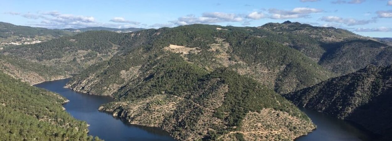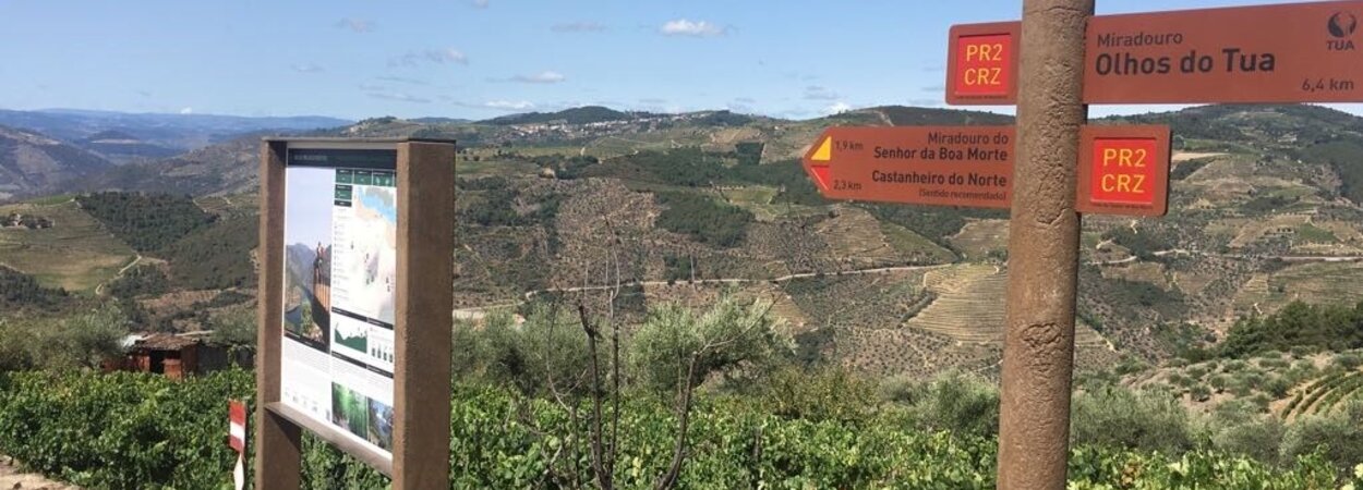 O trilho atravessa a aldeia e dirige-se para o Miradouro Olhos do Tua onde é possível ter uma vista privilegiada sobre o vale e o rio Tua.