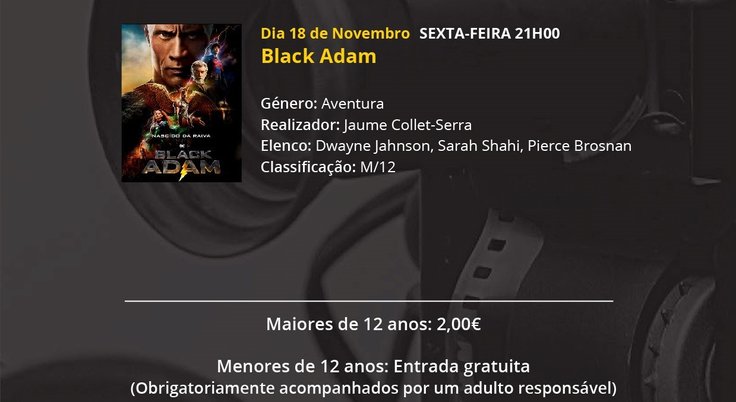 O Município de Carrazeda de Ansiães informa os seus munícipes das sessões de cinema do mês novembro. No Centro de Inovação Tecnológica Inovarural de Carrazeda de Ansiães (CITICA) será exibido o tão aguardado “Black Adam” o filme do universo de super-heróis da DC que traz Dwayne Johnson, Aldis Hodge e Pierce Brosnan numa saga aventura e ação com muito poder à mistura.