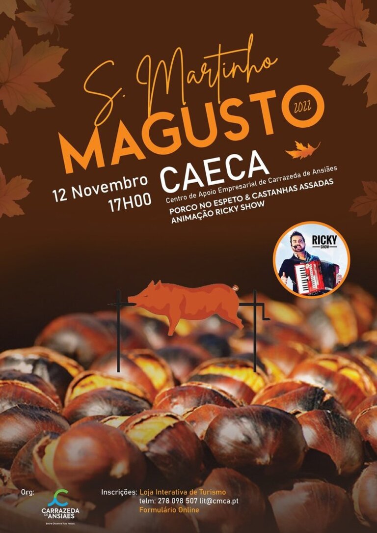Dia 12 de novembro, sábado, pelas 17h00 o Centro de Apoio Empresarial de Carrazeda de Ansiães (CAECA) é o sítio para passar o final de tarde, há porco no espeto, a tradicional castanha assada com vinho novo e animação musical com Ricky Show.